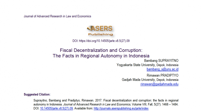 There are tricky effects of fiscal decentralization on corruption both in concept and empirical studies. This study aims to determine the influence of fiscal decentralization on corruption in local level (provinces) governments in Indonesia. Using the Supreme Court (Mahkamah Agung) cassation, in 2001-2009, this research applies econometric method exactly Tobit model to provide the evidence utilizing modified model of Yardstick Competition. Result shows that the higher the level of fiscal decentralization will increase corruption. Population also increases corruption. Detection rate from neighbor area could hit the corruption. State official salary level, GDP per capita, and literacy rates and dummy variables of special autonomy do not affect corruption. Rich areas have lower levels of corruption than the poor. Areas outside Java-Bali (non Greater Jakarta) have an average lower corruption than corruption in the area on the island of Java and Bali. The Greater Jakarta has higher corruption than others.